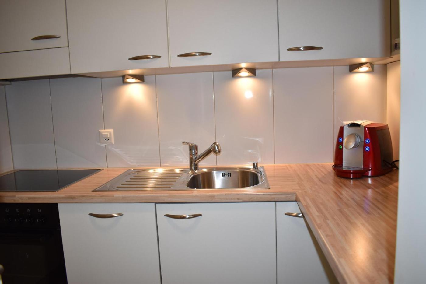 Two-Bedroom Apartment. Guests can make meals in the kitchen that features a stovetop, a refrigerator, a dishwasher and kitchenware. The apartment features a washing machine, a coffee machine, a seating area, a sofa and a TV. The unit has 2 beds.